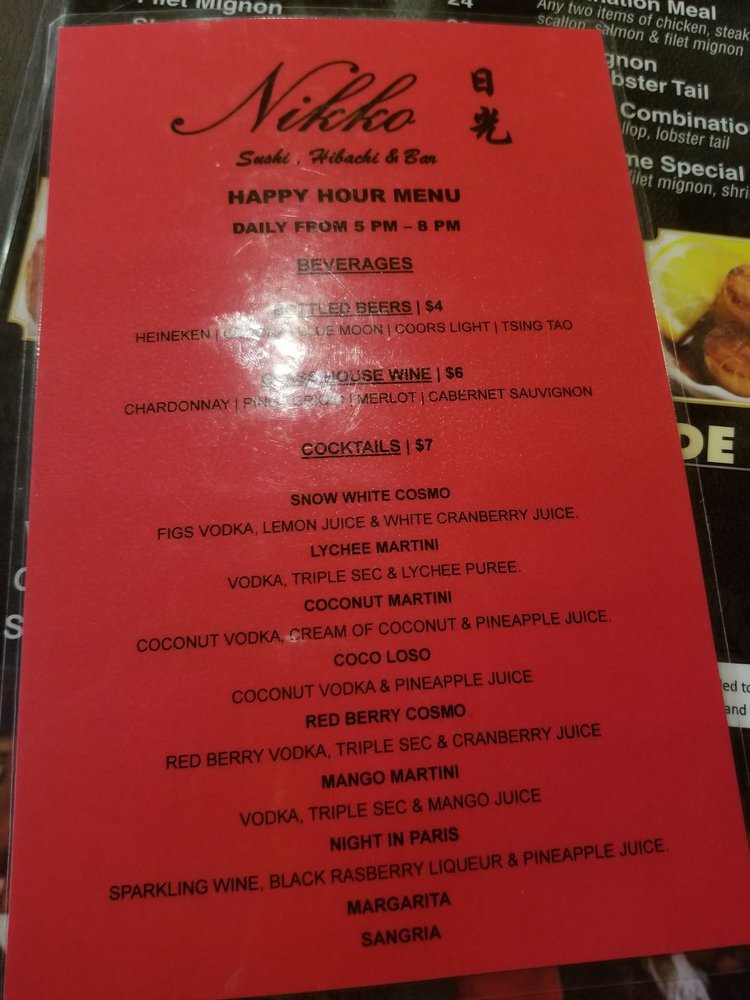 Nikko Hibachi Asian Fusion in New York offers a vibrant Thai - Sushi Bar experience with a trendy ambiance and a wide range of amenities like delivery and wheelchair accessibility. The menu features appetizers like Edamame, Shumai, and Agedashi Tofu, as well as sushi bar options like Seared Pepper Tuna and Yellowtail with Jalapeno. Customers praise the delicious food, reasonable prices, and friendly staff. The atmosphere is described as clean, classy, and perfect for special occasions. Standout dishes include the Teriyaki Salmon lunch special, Rock Shrimp Tempura, and the visually stunning Harlem Roll. Cocktails like the Summer of Love and Call Me Honey are also highly recommended. Whether dining in or ordering takeout, Nikko Hibachi Asian Fusion promises a delightful experience for all.